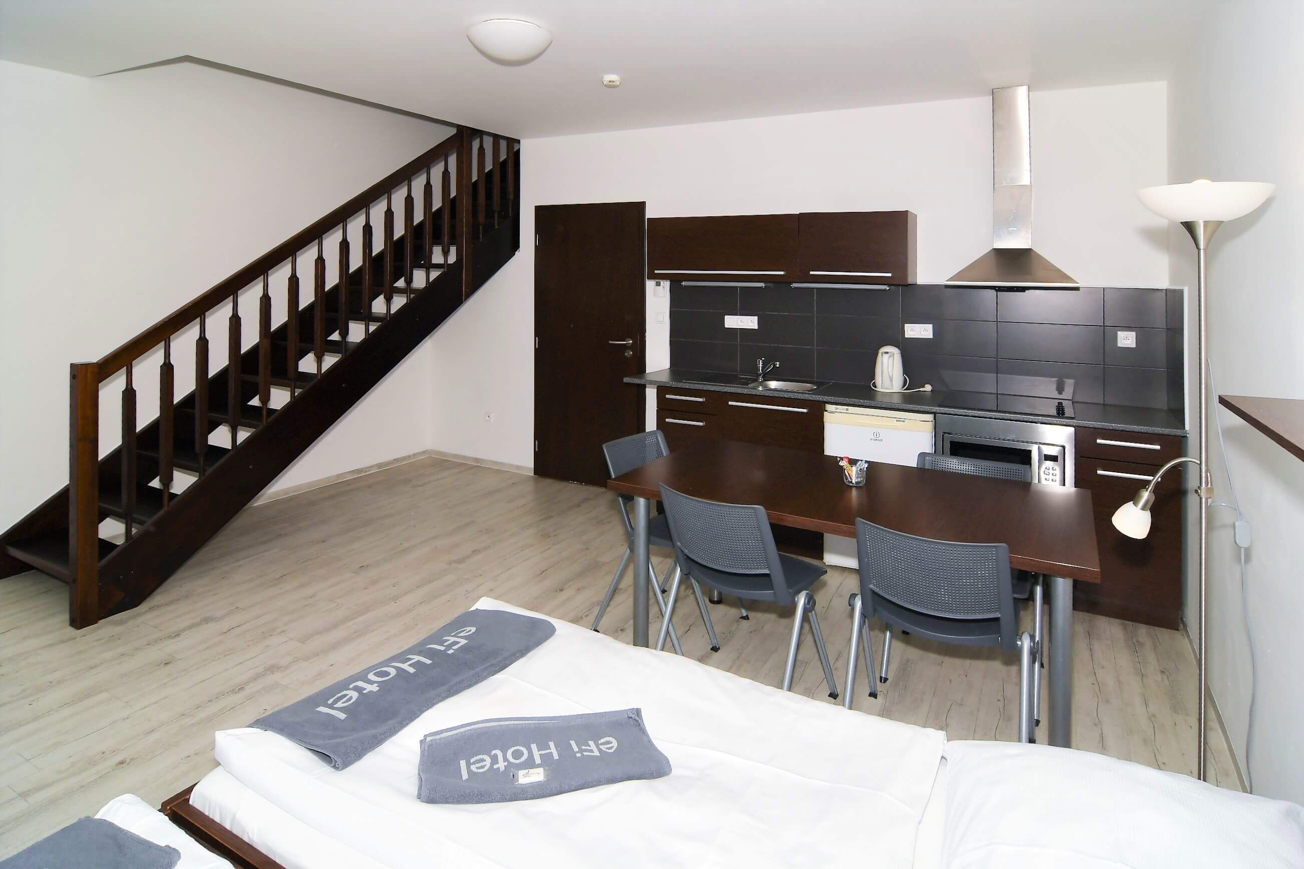 Pro studijní a pracovní pobyty nabízíme pronájmy plně zařízených bytů, včetně kuchyňských linek a elektrospotřebičů v centru Brna v hotelovém komplexu eFi Palace Hotel.