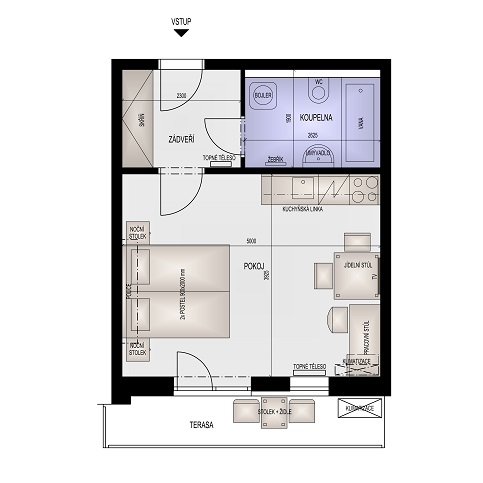 samostatně, nebo jako dvojlůžko. V předsíni je vestavěná skříň. Koupelna s vanou,